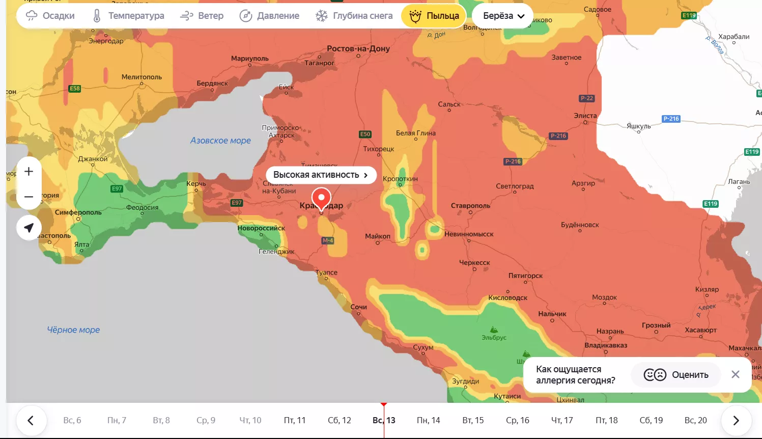 Согласно данным сервиса «Яндекс Погода», 13 апреля в большинстве районов Кубани, в том числе в Краснодаре, ожидается высокая активность пыльцы березы. Также в понедельник и во вторник, 14-15 апреля, в регионе будет умеренная активность растений-аллергенов.