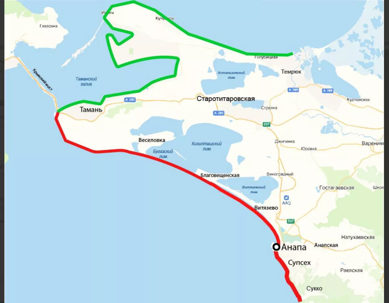 На территории Анапы в зону ЧС попали все городские пляжи. В Темрюкском районе доступными для купания остаются около 130 км берега. Это пляжи станицы Тамань и поселка Сенной в Таманском заливе, а также все побережье Азовского моря — от поселка Ильич до станицы Голубицкой. Эти участки на карте отмечены зеленым цветом.