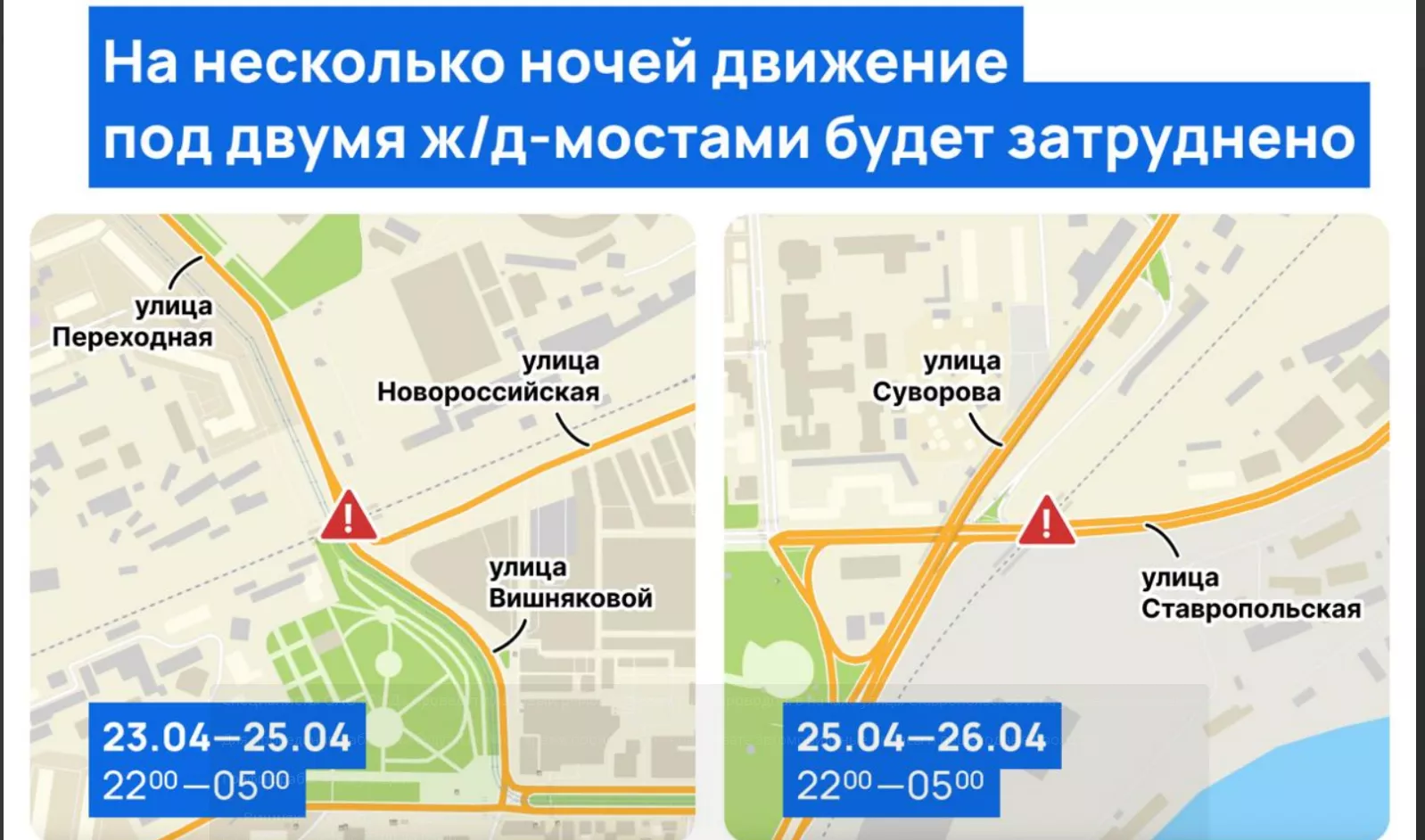 23 апреля департамент транспорта Краснодара сообщил, что специалисты РЖД проведут плановый ремонт двух мостов — в начале улицы Ставропольской и на Вишняковой. В ночное время на путепроводах будут поочередно перекрывать автомобильные полосы и пешеходные проходы.