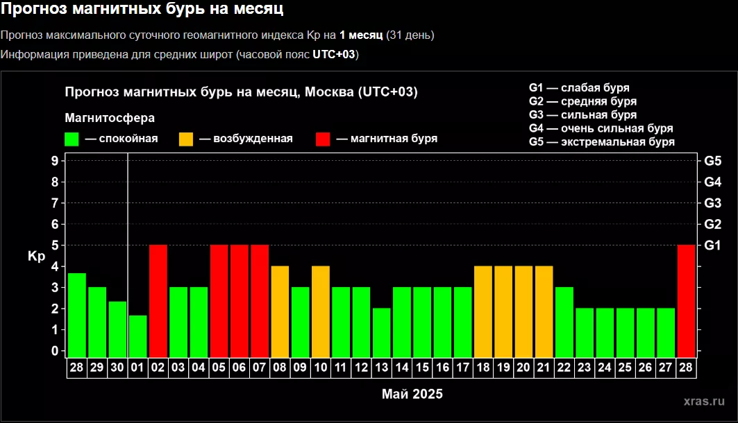 Бури ожидаются 2, 5, 6, 7 и 28 мая. Однако сила возмущения составит 5 баллов из 9, поэтому колебания будут слабыми и не превысят уровня G1.