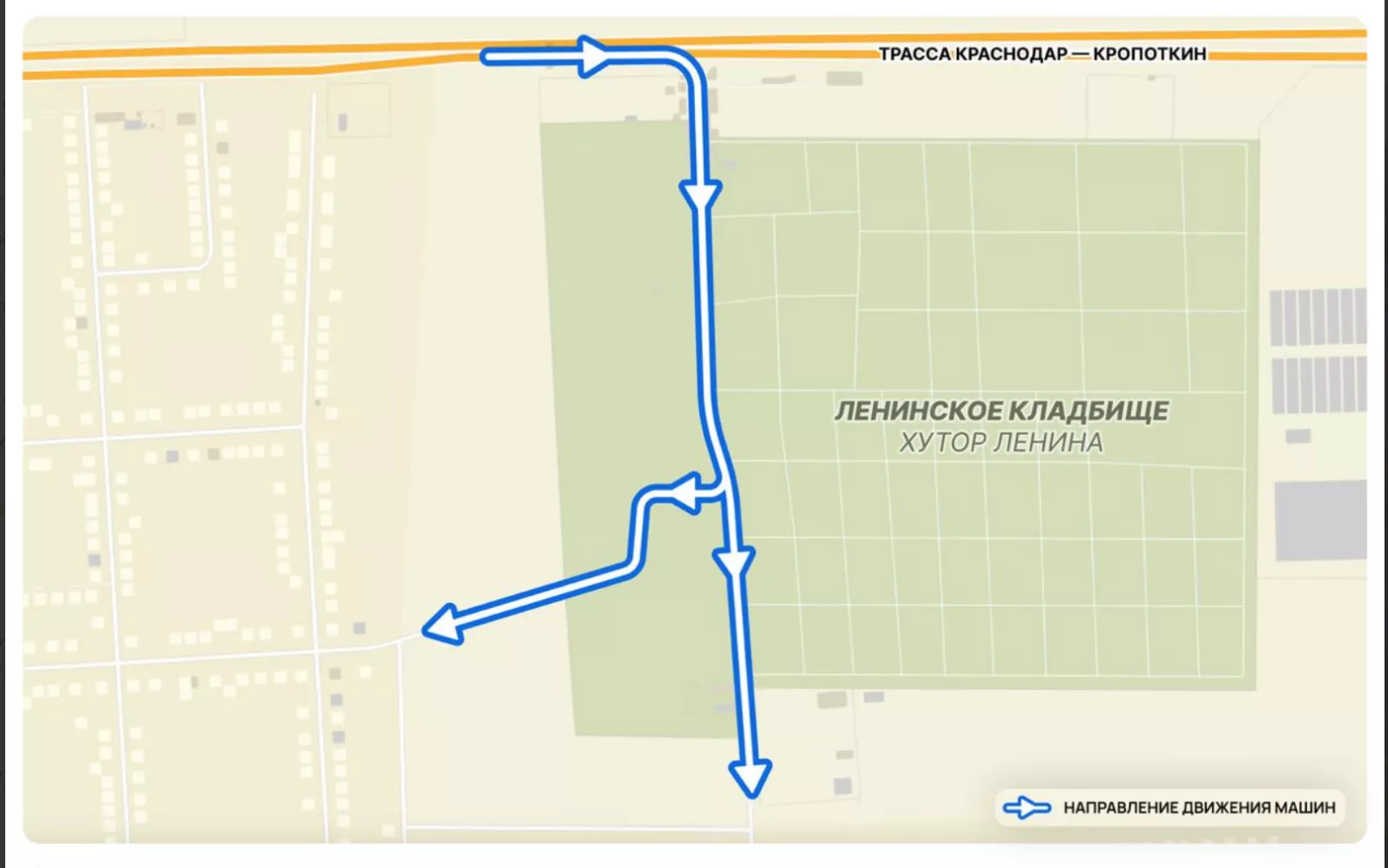 Власти рекомендовали организовать одностороннее движение и на Ленинском кладбище с заездом с трассы «Краснодар — Кропоткин».