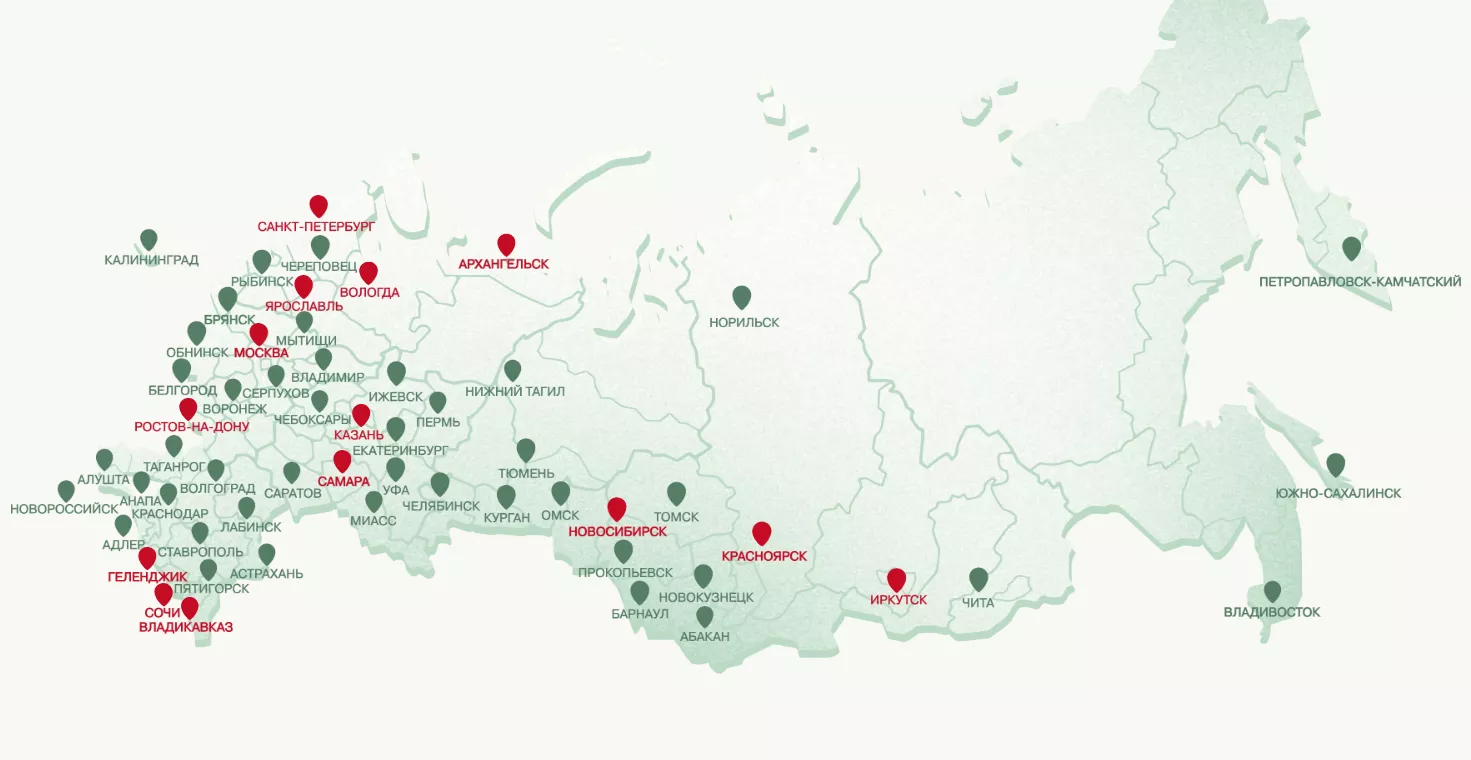 На карте красным цветом отмечены заведения Санкт-Петербурга, Москвы, Казани, Ростова-на-Дону и других городов. Ожидается, что список мест будет пополняться.