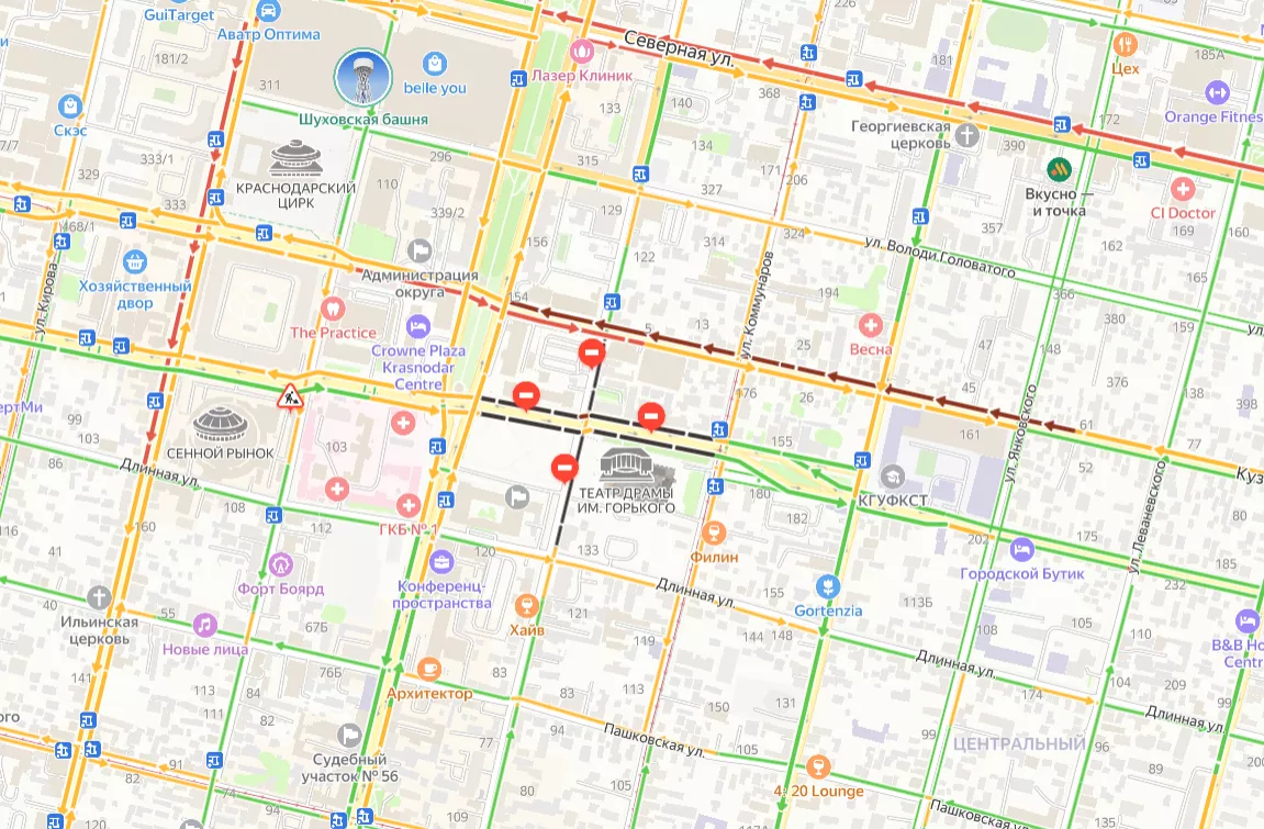 6 мая департамент транспорта Краснодара сообщил, что до 14:00 в городе перекрыли участки рядом с Главной городской площадью. Это сделали для проведения мероприятия, посвященного 80-летию Великой Победы.