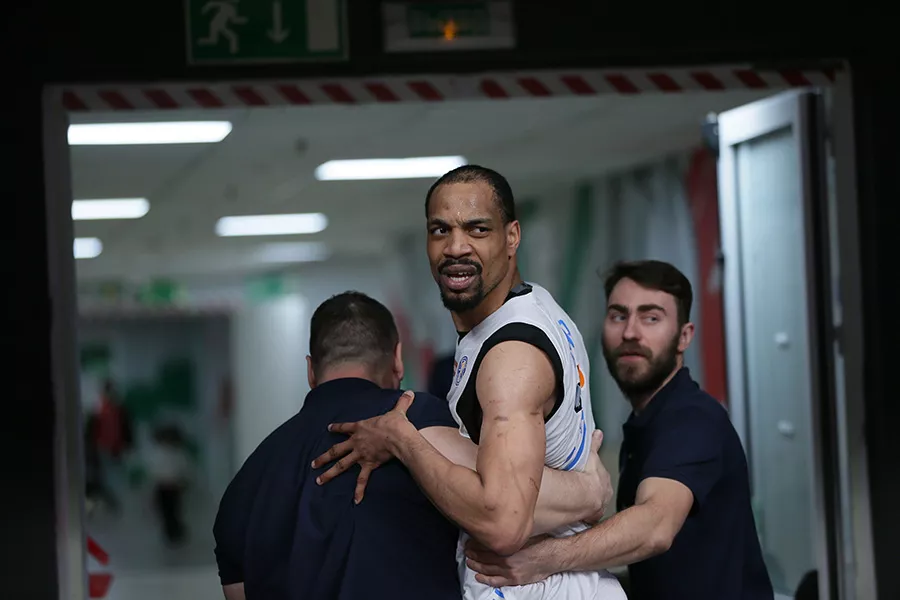 Во второй четверти за споры с судьей два технических фола получил основной центровой «Зенита» Винс Хантер. Покидая площадку, игрок сначала опрокинул ногой рекламный борт...
