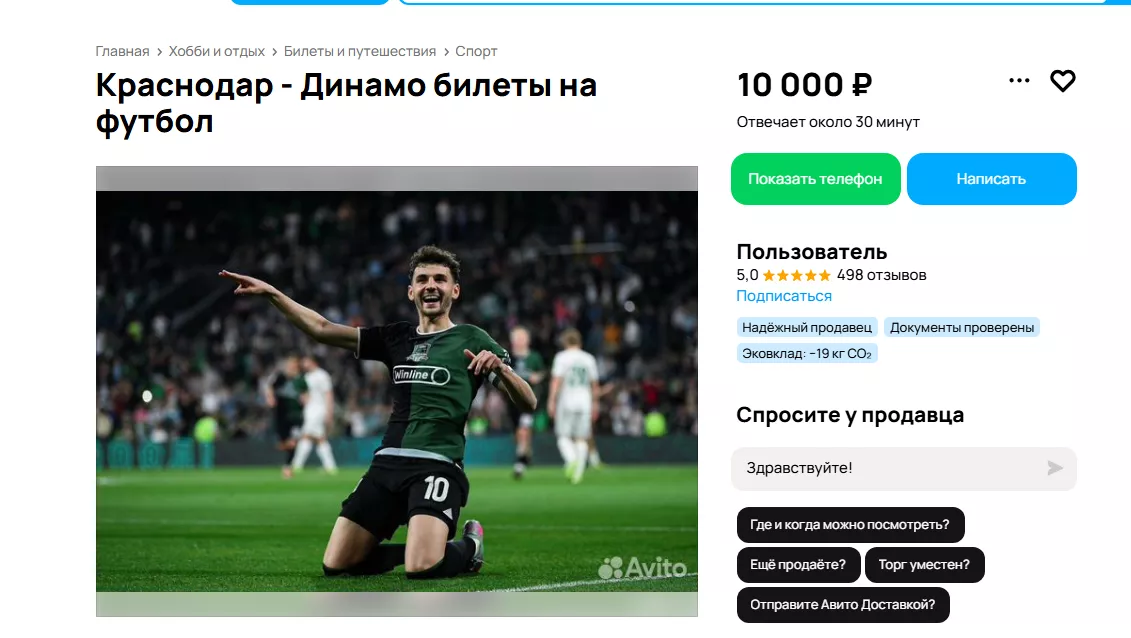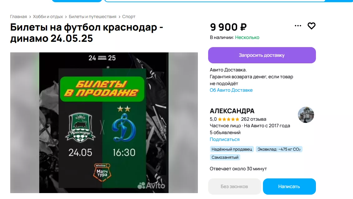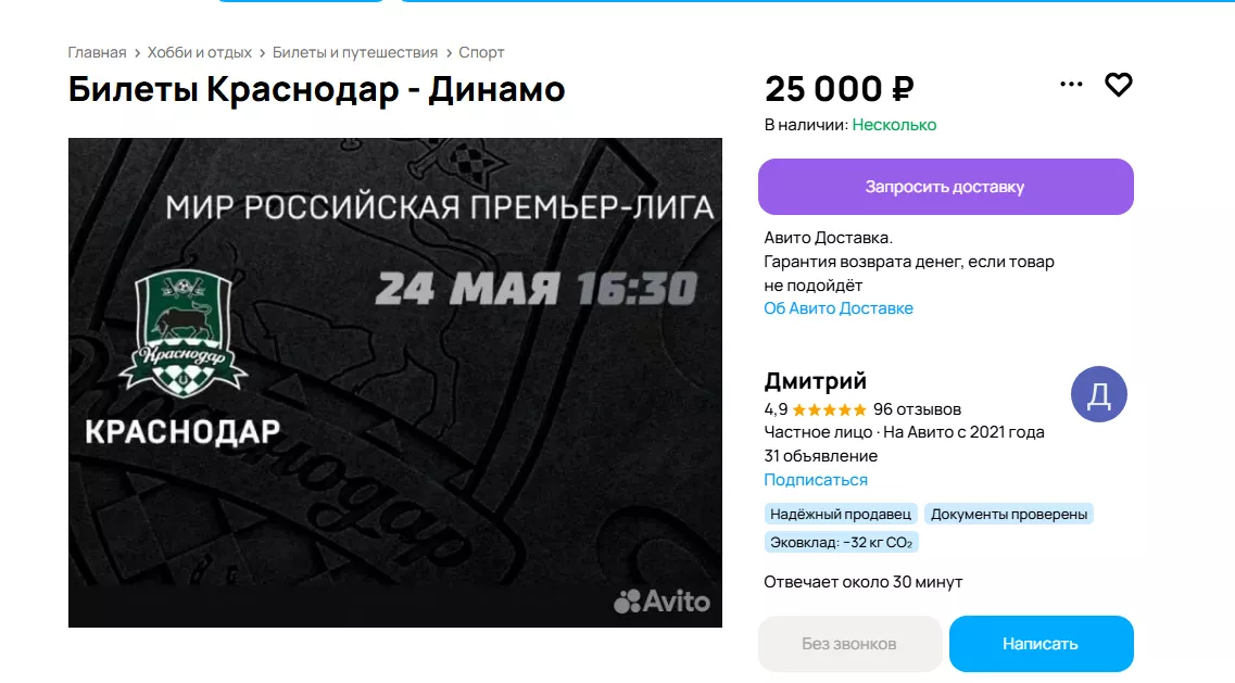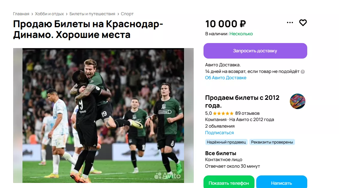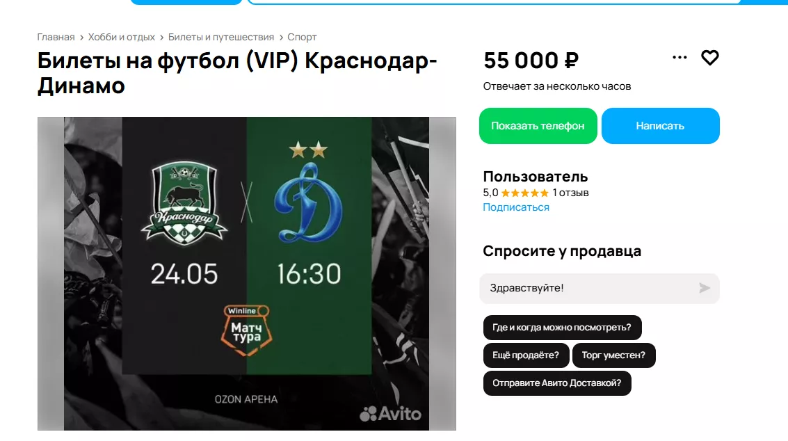 Почти сразу перекупщики стали размещать сообщения о продаже билетов на матч «Краснодара» с «Динамо» на сайтах объявлений. Они предлагают купить места на спортивное событие с очень большой наценкой — до восьми раз.