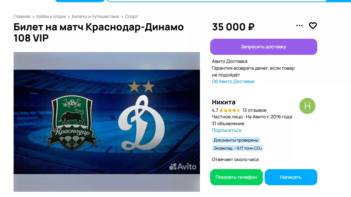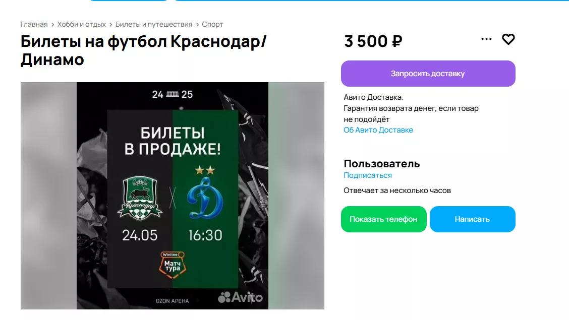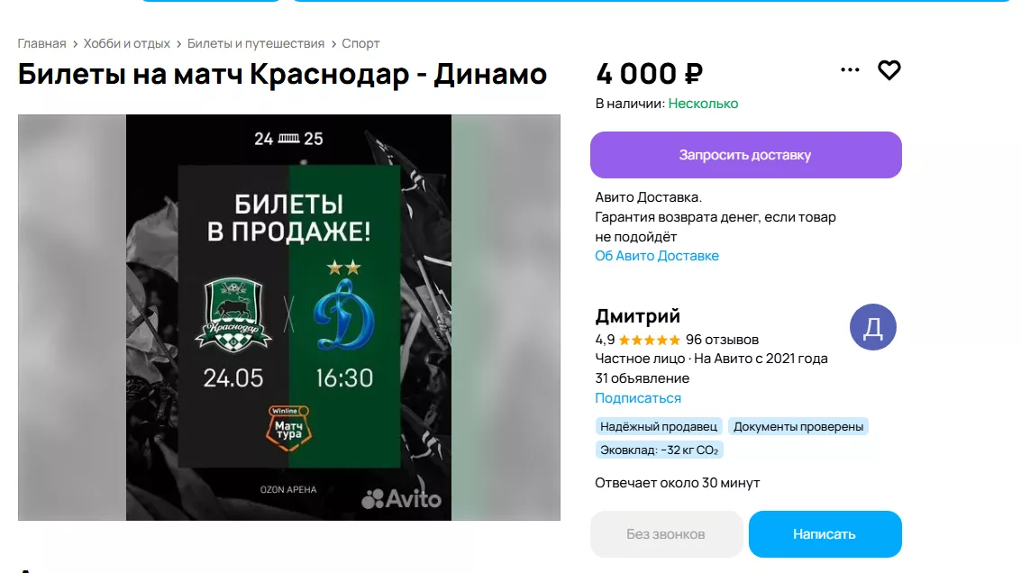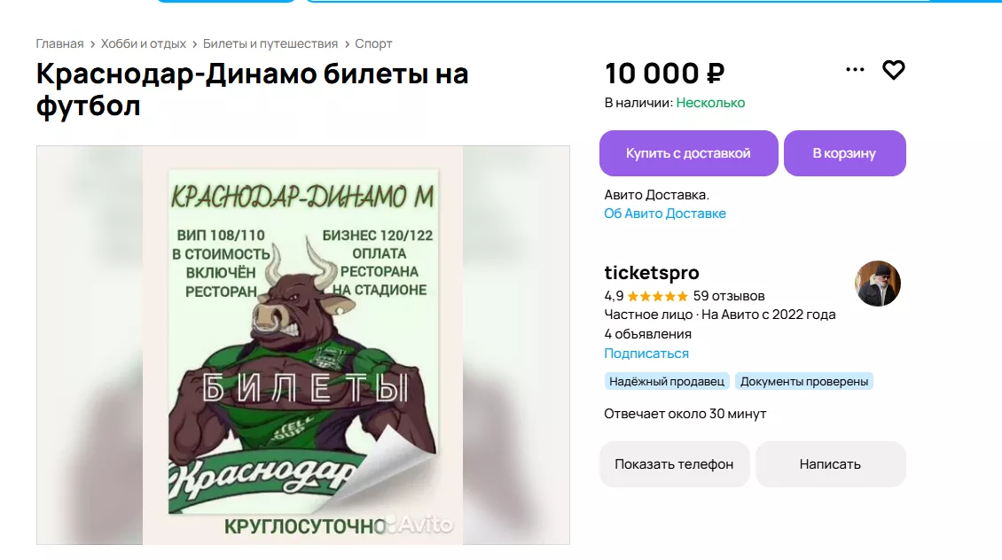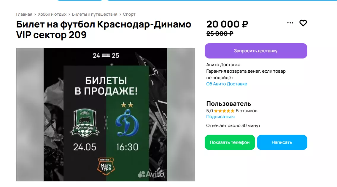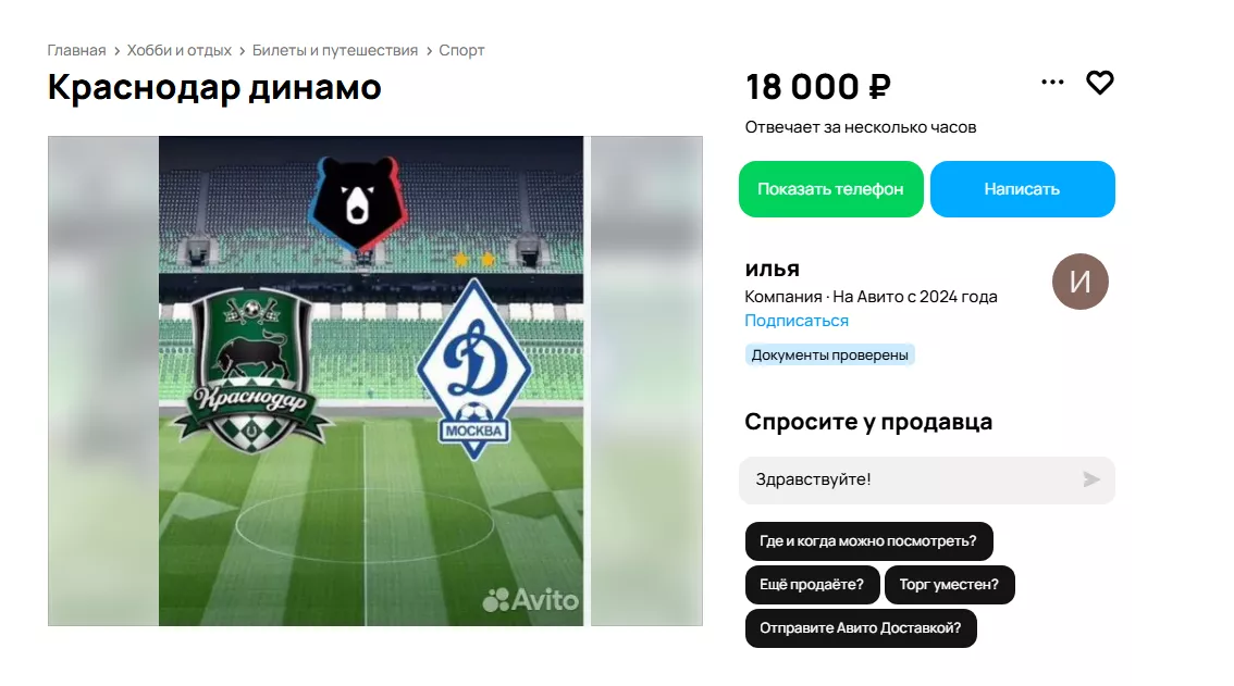 Почти сразу перекупщики стали размещать сообщения о продаже билетов на матч «Краснодара» с «Динамо» на сайтах объявлений. Они предлагают купить места на спортивное событие с очень большой наценкой — до восьми раз.
