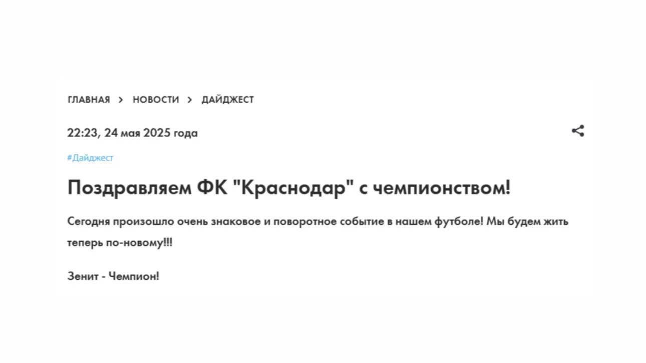 «Зенит» также поздравил «Краснодар», но с фразой «Зенит — чемпион!». Поздравление появилось 24 мая на официальном сайте сине-бело-голубых. При этом сообщение не было похоже по стилю на другие посты клуба.