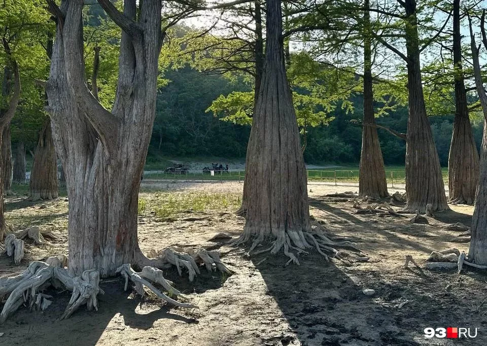 Причина обмеления водоема — засушливые зима и весна 2025 года. Озеро питается преимущественно осадками, поэтому из-за отсутствия дождей уровень воды опустился, а корни болотных кипарисов обнажились.