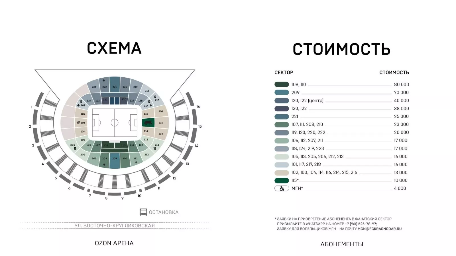Стоимость зависит от сектора, на который покупается абонемент. Сейчас цена достигает 80 тыс. рублей. Маломобильные группы населения (МГН) могут пройти на стадион за 4 тыс. рублей, а на фан-сектор (115) — за 10 тыс. рублей.