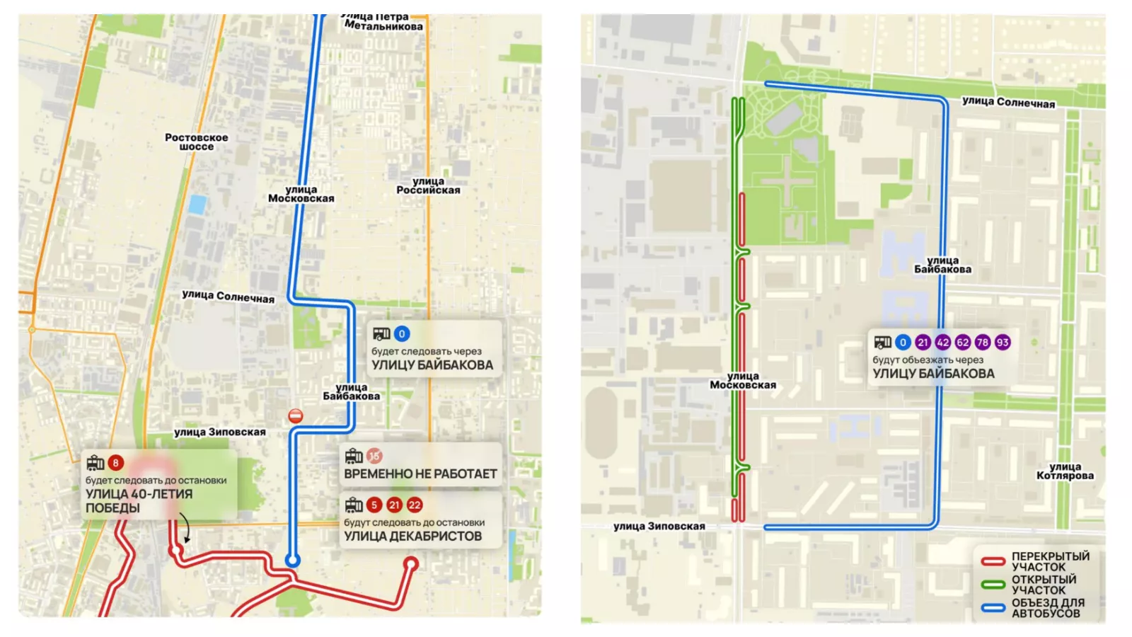 - автобусы № 0, 21, 42, 62, 78 и 93 будут объезжать улицу Московскую через улицу Байбакова.