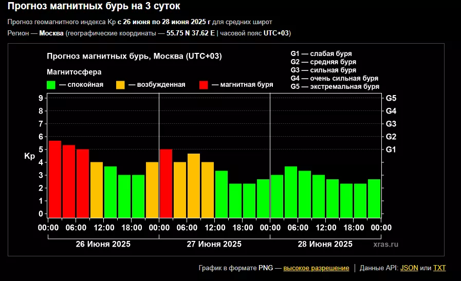 Напомним, всего у магнитных бурь пять уровней: G1 — незначительные, G2 — умеренные, G3 — сильные, G4 — тяжелые, G5 — экстремально сильные. Считается, что они способны влиять на самочувствие. Среди симптомов — головные боли, слабость и резкие перепады артериального давления.