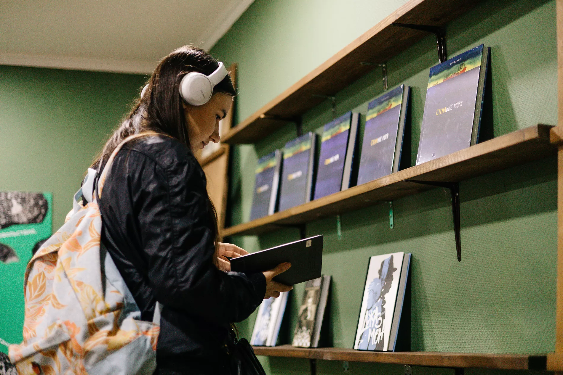 Внутри расположены книжный магазин, кофейня и лекторий. Залы оформлены в разных оттенках природы: от светлого пшеничного поля до темного соснового бора.