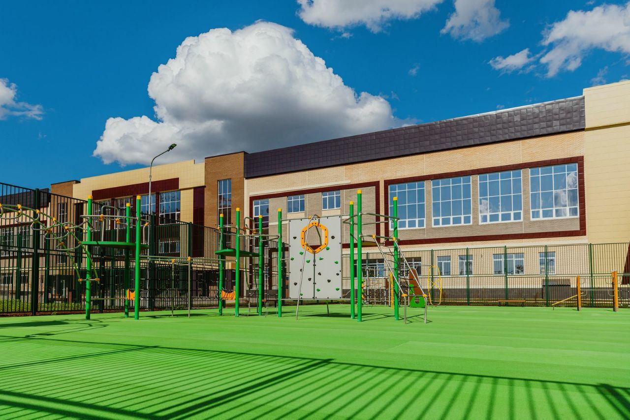 Во дворе обустроили универсальные спортивные площадки для волейбола, баскетбола, футбола и занятий ОБЖ, проложили беговые дорожки вокруг стадиона, оборудовали зоны для подвижных игр и отдыха учеников разных возрастов.