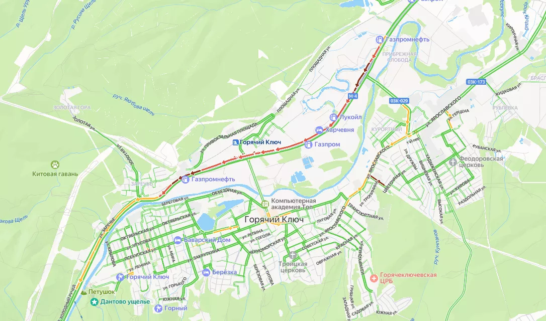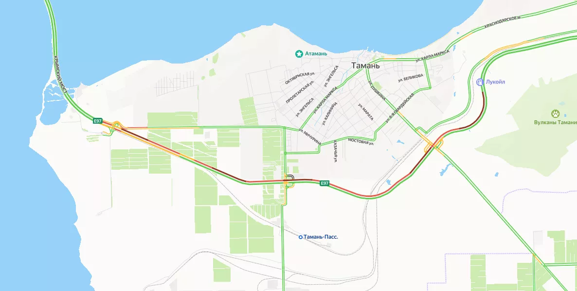 По данным «Яндекс.Карты», он начинается от заправки «Газпромнефть» и расстилается на протяженности более 5 километров. Обратная дорога, в сторону Адыгеи, свободная.