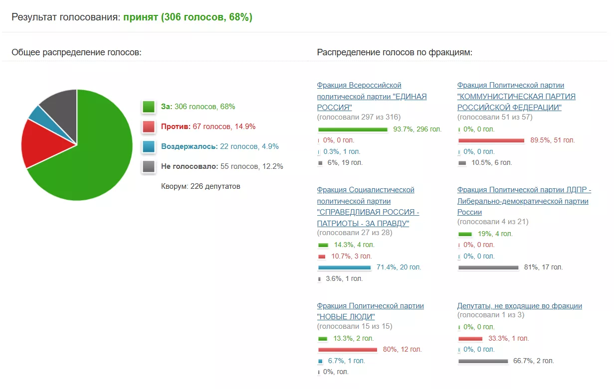 22 июля Госдума приняла в третьем, окончательном чтении резонансный закон, вводящий административные штрафы за поиск в интернете «экстремистских» материалов. Инициатива была принята голосами фракции «Единая Россия». Большинство представителей КПРФ и «Новых людей» проголосовало против законопроекта, «Справедливой России — За правду!» — воздержалось, а ЛДПР — не участвовало в голосовании.