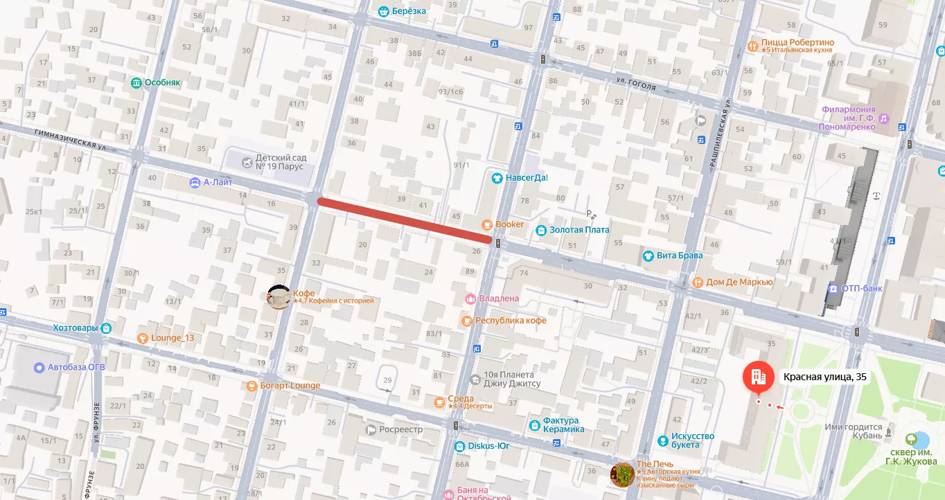 Пресс-служба администрации Краснодара сообщила, что с 5 по 19 августа на участке улицы Гимназической от Кирова до Октябрьской ограничат движение транспорта.