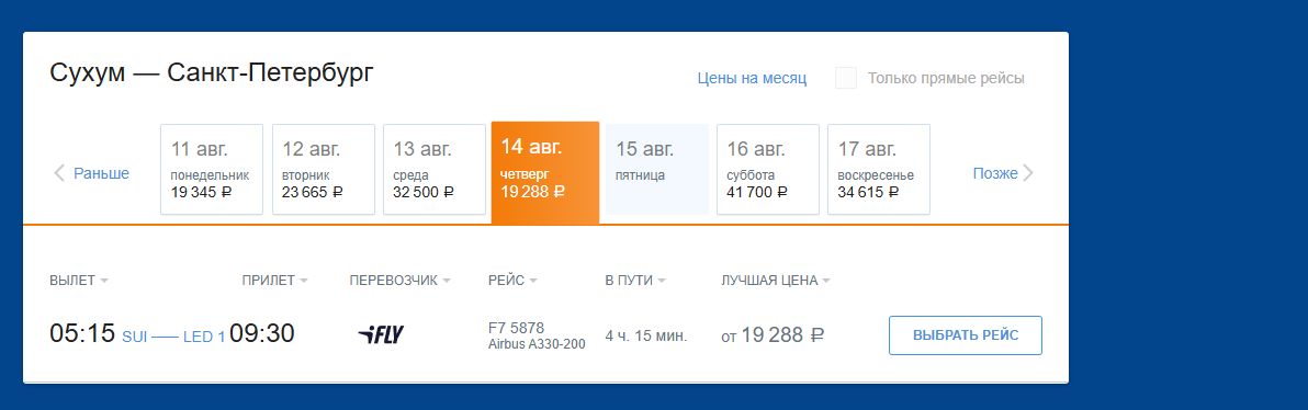 Первый самолет из Сухума в Питер также отправится 14 августа (вылет в 9:15, прилет — в 13:30). Стоимость билета — от 19 288 рублей. Билеты также доступны на сайте «Аэрофлота».
