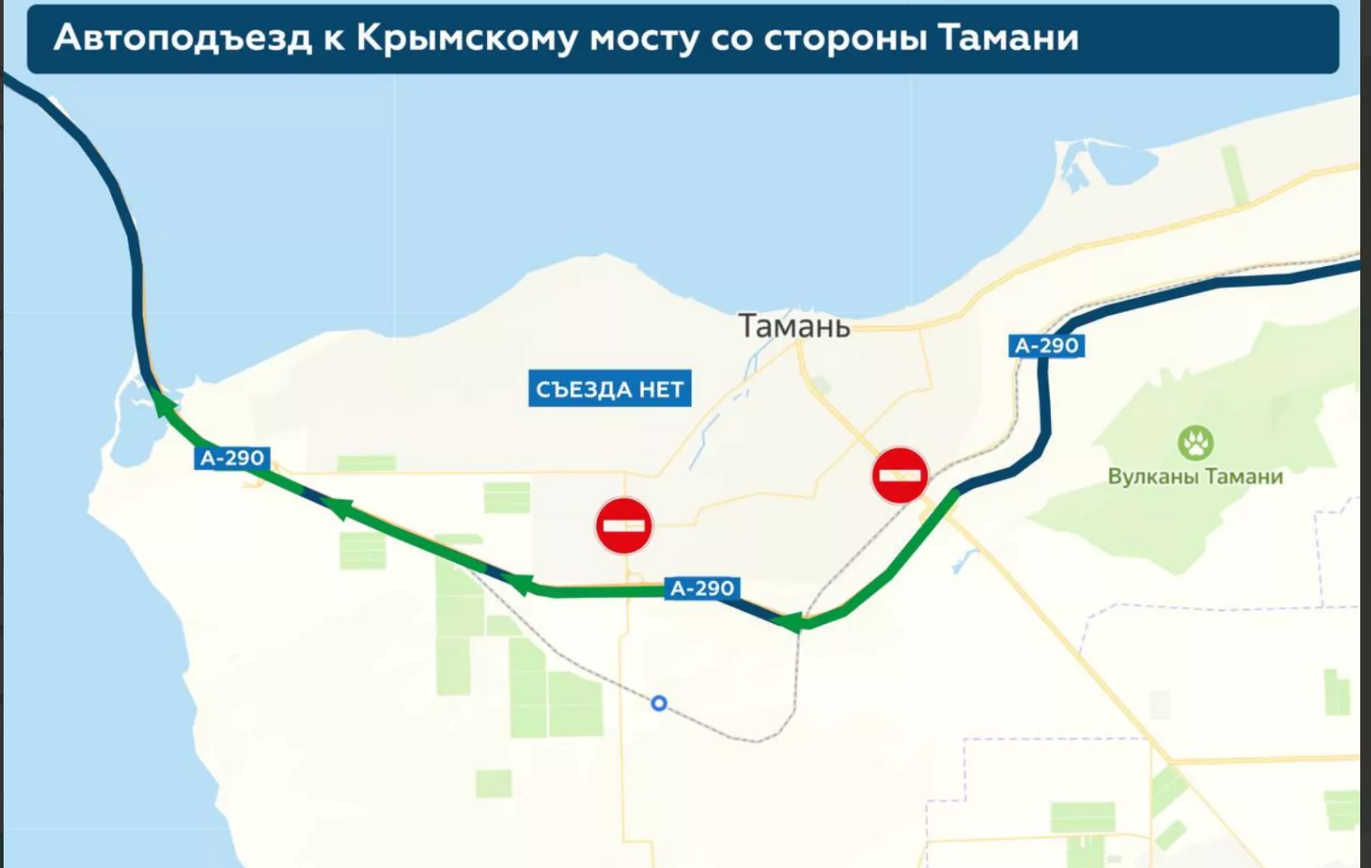 6 августа телеграм-канал «Крымский мост: оперативная информация» сообщил, что водители теперь могут проехать на полуостров со стороны Тамани только по федеральной трассе А-290. Следовать другими маршрутами запрещено.