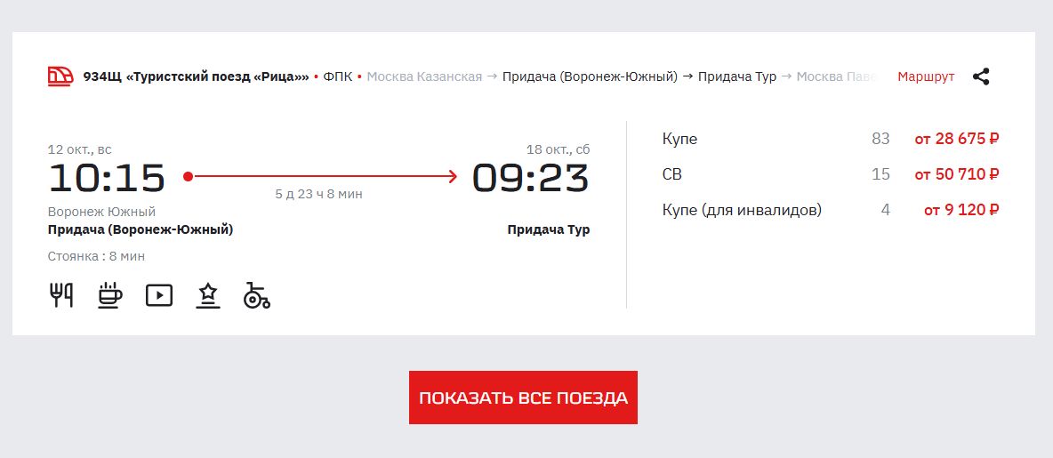 Проезд из Москвы в купе стоит от 37 тыс. рублей, в СВ — от 68 тыс. рублей. Из Воронежа — от 28 тыс. рублей и 50 тыс. рублей соответственно.