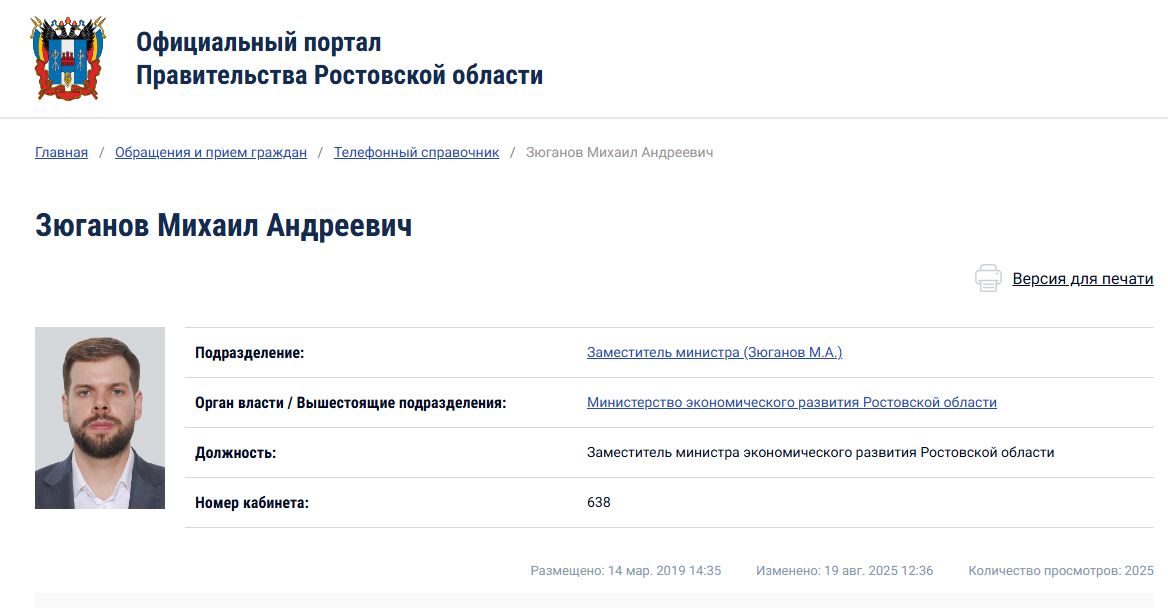 19 августа на сайте правительства Ростовской области появилась информация, что одним из заместителей министра экономики региона стал Михаил Зюганов — внук главы КПРФ Геннадия Зюганова. Он будет курировать реализацию нацпроектов и укреплять связи с высшими органами власти.