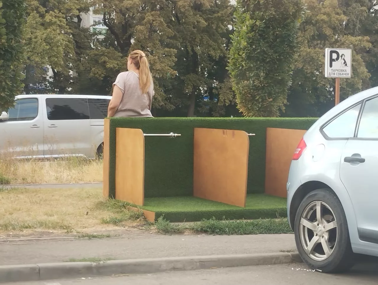 Трехсекционная парковка представляет собой деревянный каркас с настилом из искусственной травы. На стене есть ручка для привязывания пса. Примечательно, что у паркинга нет крыши — во время дождя животным придется мокнуть.