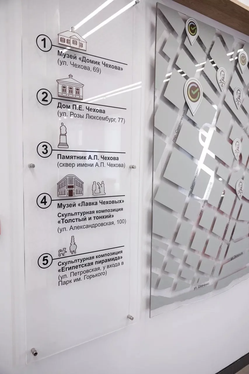 В отделении разместили портрет писателя, названия его произведений и карту с памятными местами Таганрога, связанными с Чеховым. Рядом с картой находится QR-код для прослушивания его аудиокниг.