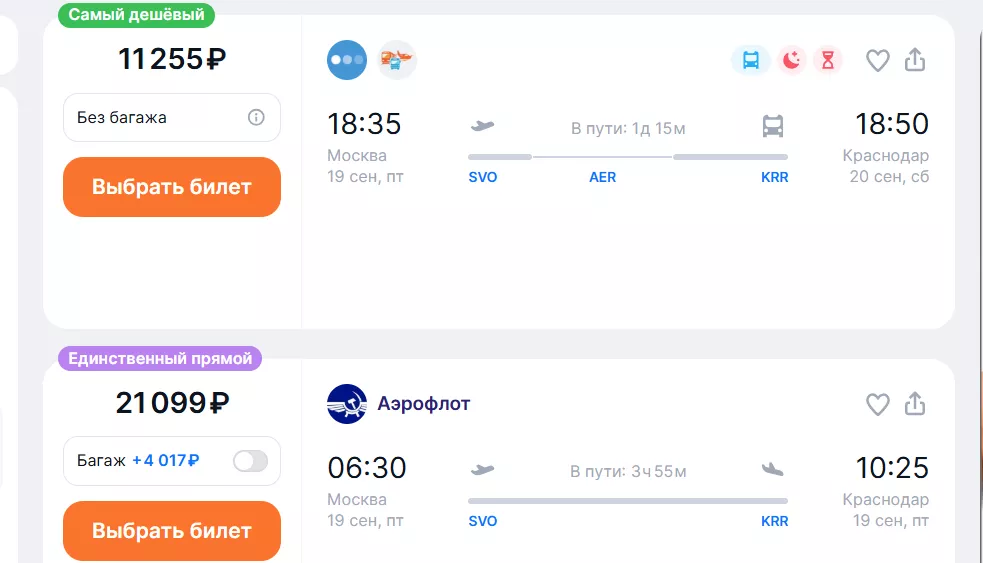 РБК сообщил, что стоимость билета от компании «Победа» с вылетом 19 сентября составляет 8,8 тыс. рублей. Однако ни на сайте перевозчика, ни на «Авиасейлс» Юга.ру не нашли этому подтверждение.