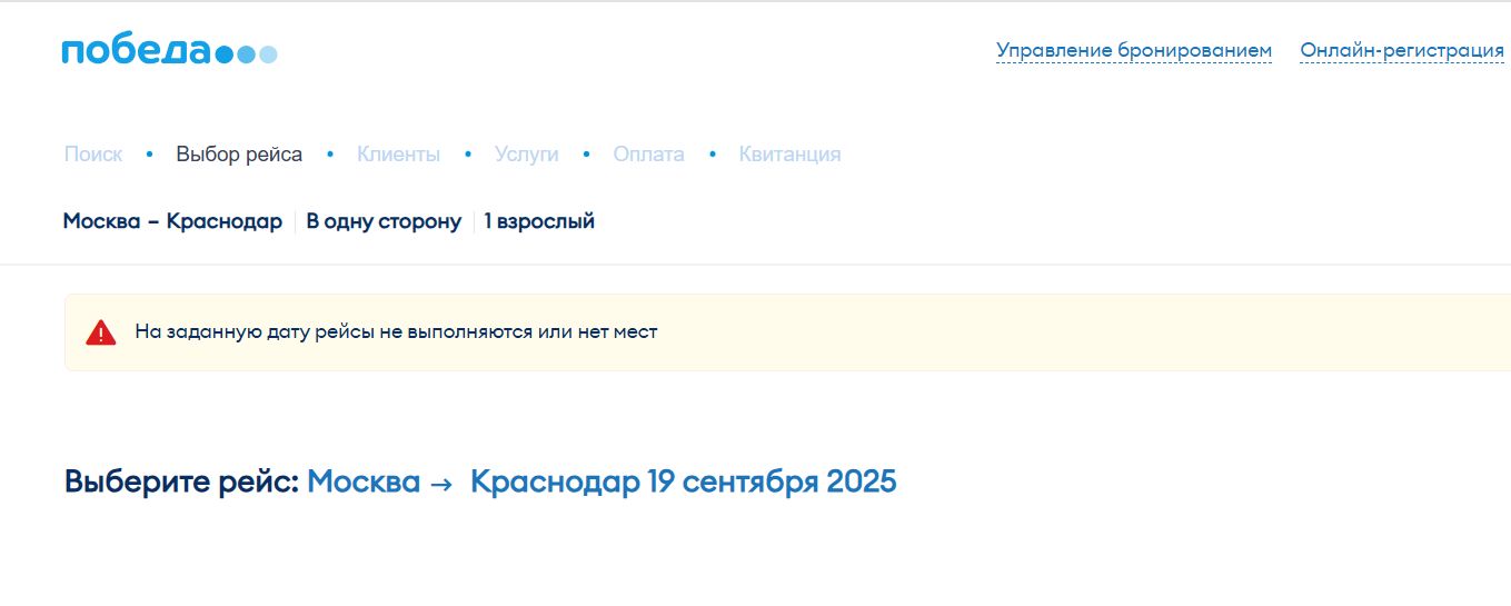 РБК сообщил, что стоимость билета от компании «Победа» с вылетом 19 сентября составляет 8,8 тыс. рублей. Однако ни на сайте перевозчика, ни на «Авиасейлс» Юга.ру не нашли этому подтверждение.