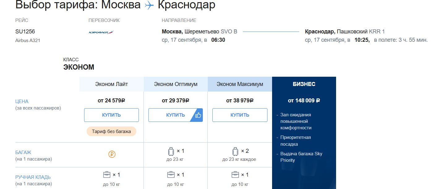 Стоимость авиабилета из Москвы (Шереметьево) в Краснодар с вылетом 17 сентября стартует от 24 тыс. 579 рублей, следует из данных сайта компании «Аэрофлот». Из столицы самолет отправится в 06:30, время в пути составит 3 часа 55 минут.
