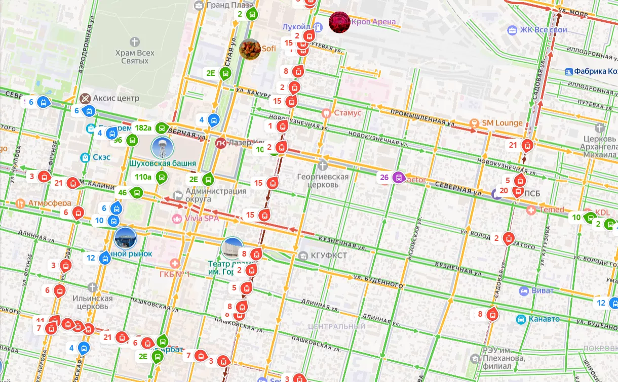 Маршруты № 5, 8, 15, 2 и 1 едут от улицы Московской по Садовой. Трамваи № 5 и 8 следуют от кооперативного рынка через Индустриальную.
