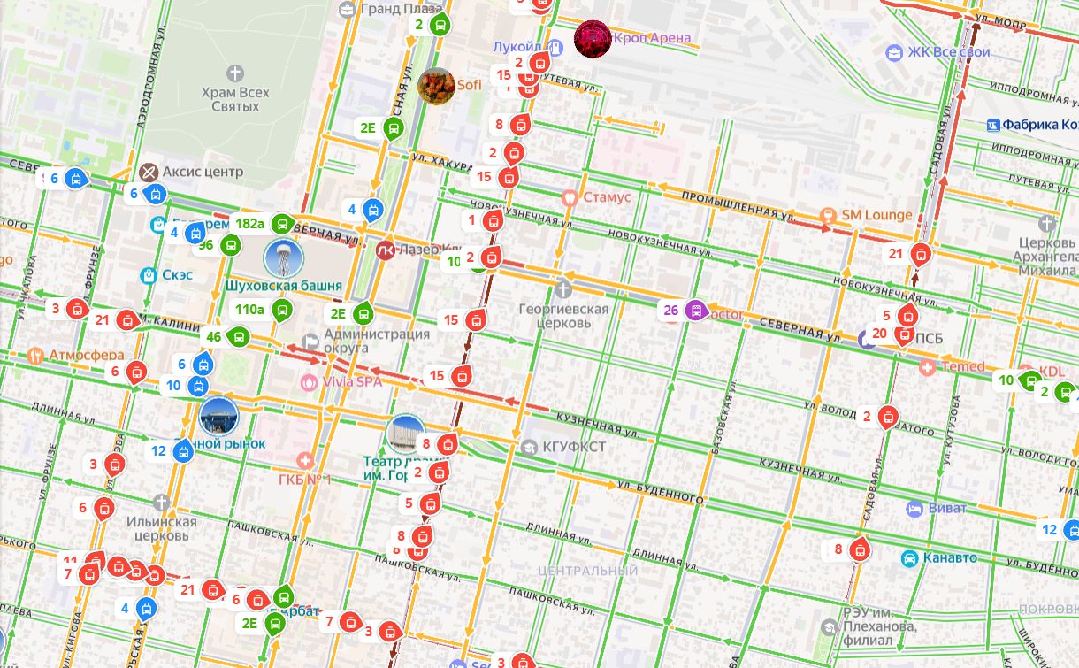 Маршруты № 5, 8, 15, 2 и 1 едут от улицы Московской по Садовой. Трамваи № 5 и 8 следуют от кооперативного рынка через Индустриальную.