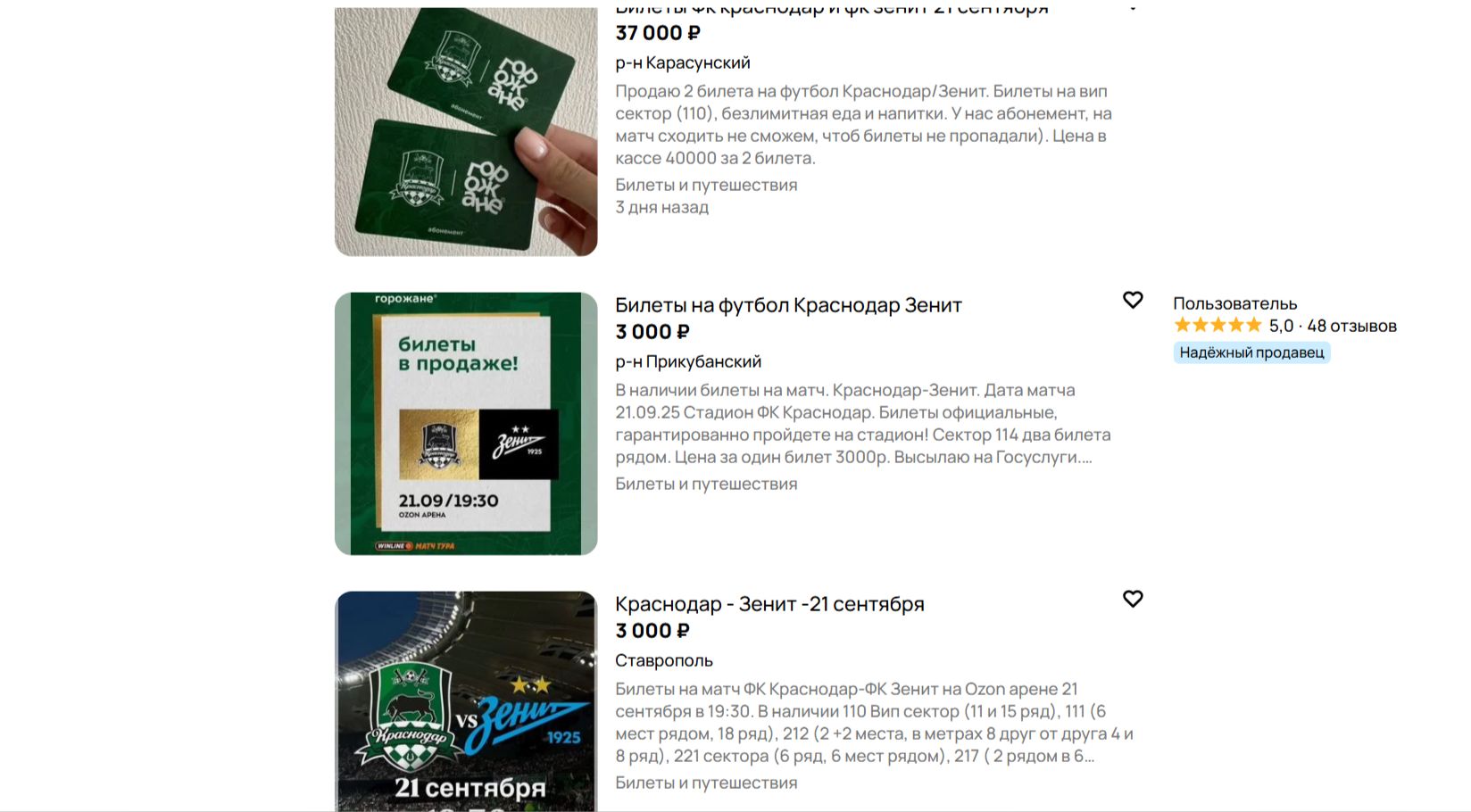 Также перекупщики стали размещать сообщения о продаже билетов на матч «Краснодара» с «Зенитом» на популярном сайте объявлений. Стоимость места варьируется от 2,5 тыс. до 20 тыс. рублей.