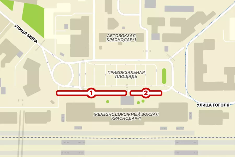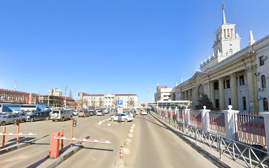 • Привокзальная площадь Краснодара. С 22 сентября 2025 г. будет закрыта на ремонт полоса справа (та, что не закрыта шлагбаумами) © Скриншот сайта Google.com/maps