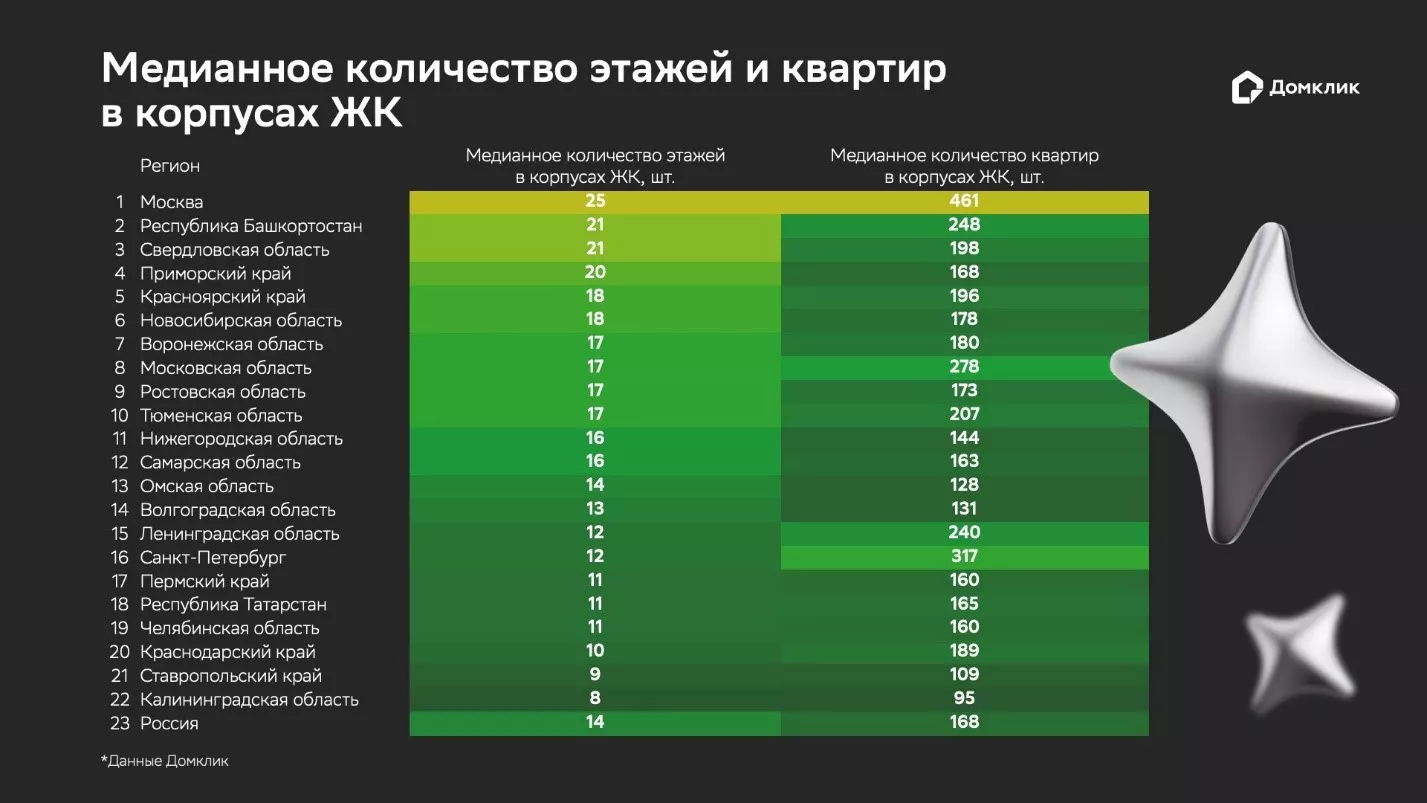 Кроме того, в Краснодарском крае, как и в Подмосковье, много высотных комплексов в 20-21 этаж. Но средняя этажность зданий в регионе составляет 10 этажей, а в одном корпусе в среднем насчитывается 189 квартир.