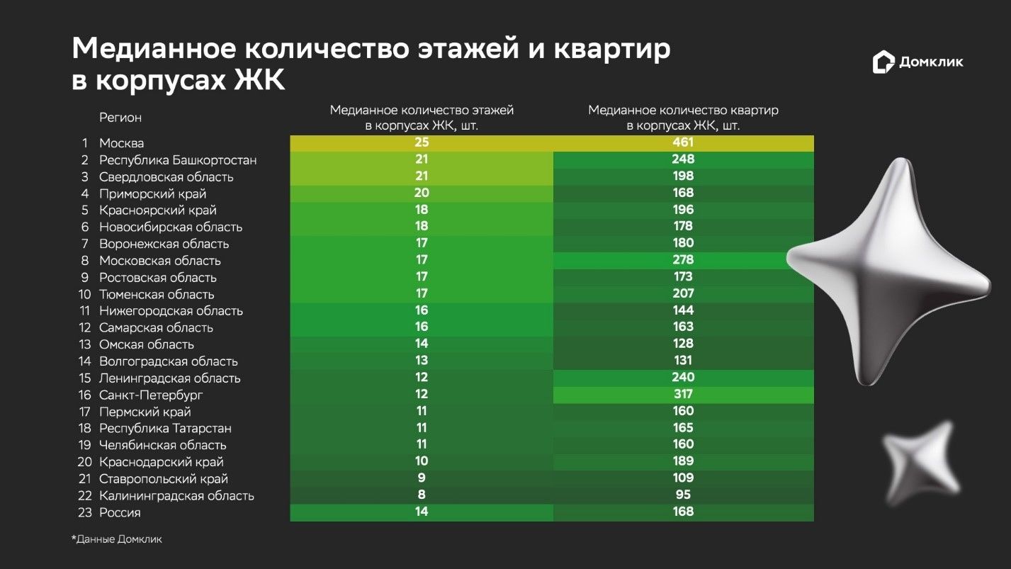 Кроме того, в Краснодарском крае, как и в Подмосковье, много высотных комплексов в 20-21 этаж. Но средняя этажность зданий в регионе составляет 10 этажей, а в одном корпусе в среднем насчитывается 189 квартир.