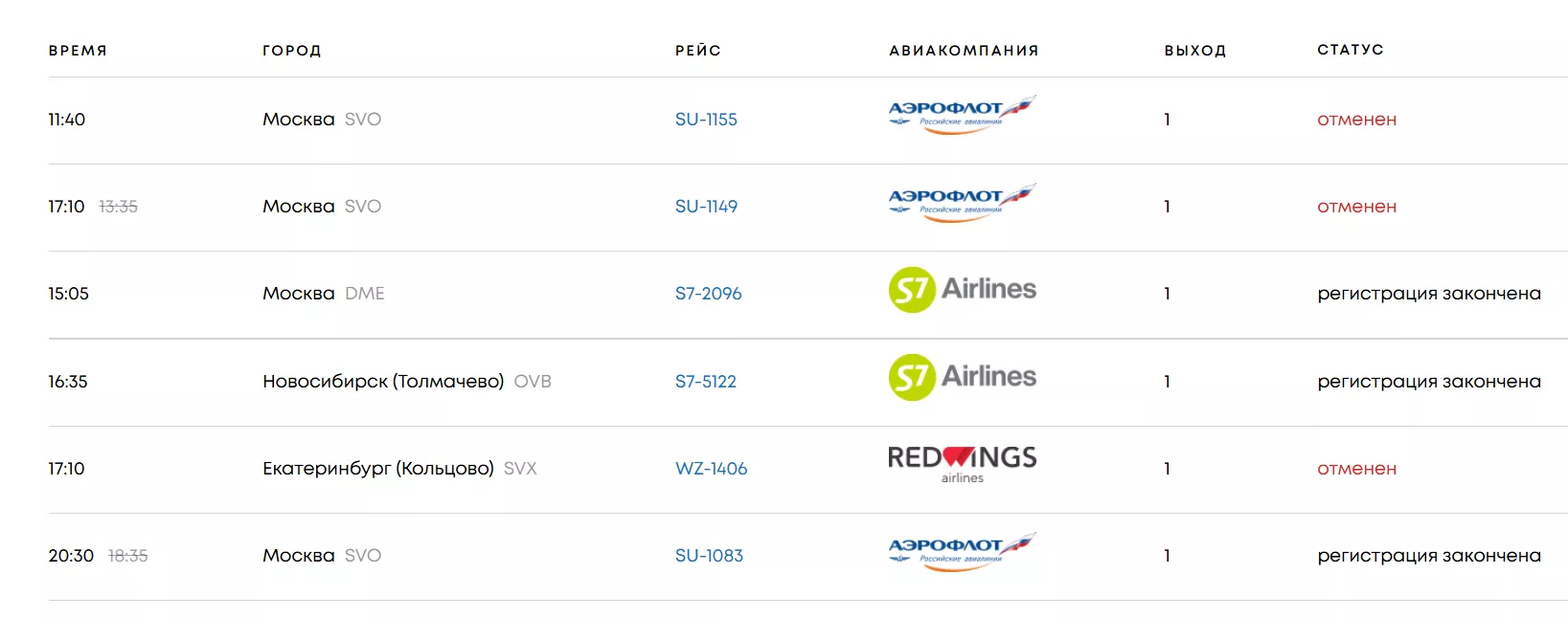 Согласно онлайн-табло, рейсы в Екатеринбург и Москву отменили. На прилет отмен и задержек нет.