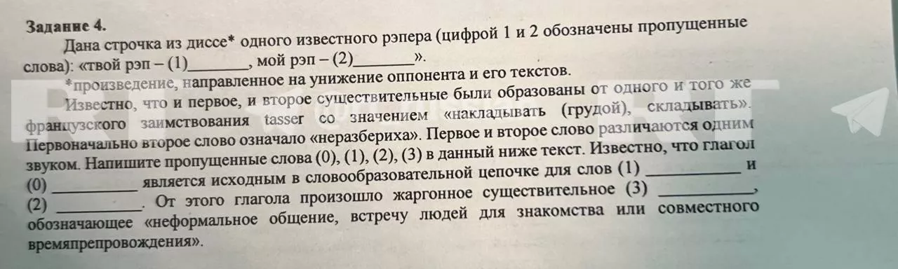 Отметим, что в заданиях для 11-х классов предлагалось вставить пропущенные слова в текст дисса (высказывание неуважения одного рэппера к другому): «Твой рэп — …, мой рэп — …» При этом напрямую Оксимирона* не упоминали — его назвали «одним известным рэпером».