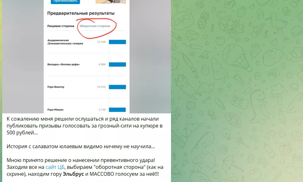 «К сожалению, меня решили ослушаться и ряд каналов начали публиковать призывы голосовать за «Грозный-сити» на купюре в 500 рублей. Мною принято решение о нанесении превентивного удара. Заходим все на сайт ЦБ, выбираем «оборотная сторона», находим гору Эльбрус и массово голосуем за нее», — написал он.