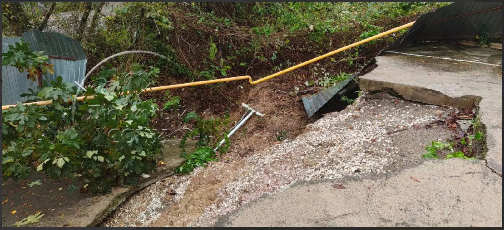 В результате движения грунта часть ближайшей парковки просела примерно на три метра — образовался глубокий обрыв. На опубликованных кадрах видно, что земля сдвинулась в сторону дороги, повалились деревья и обрушилась часть бетонного покрытия.