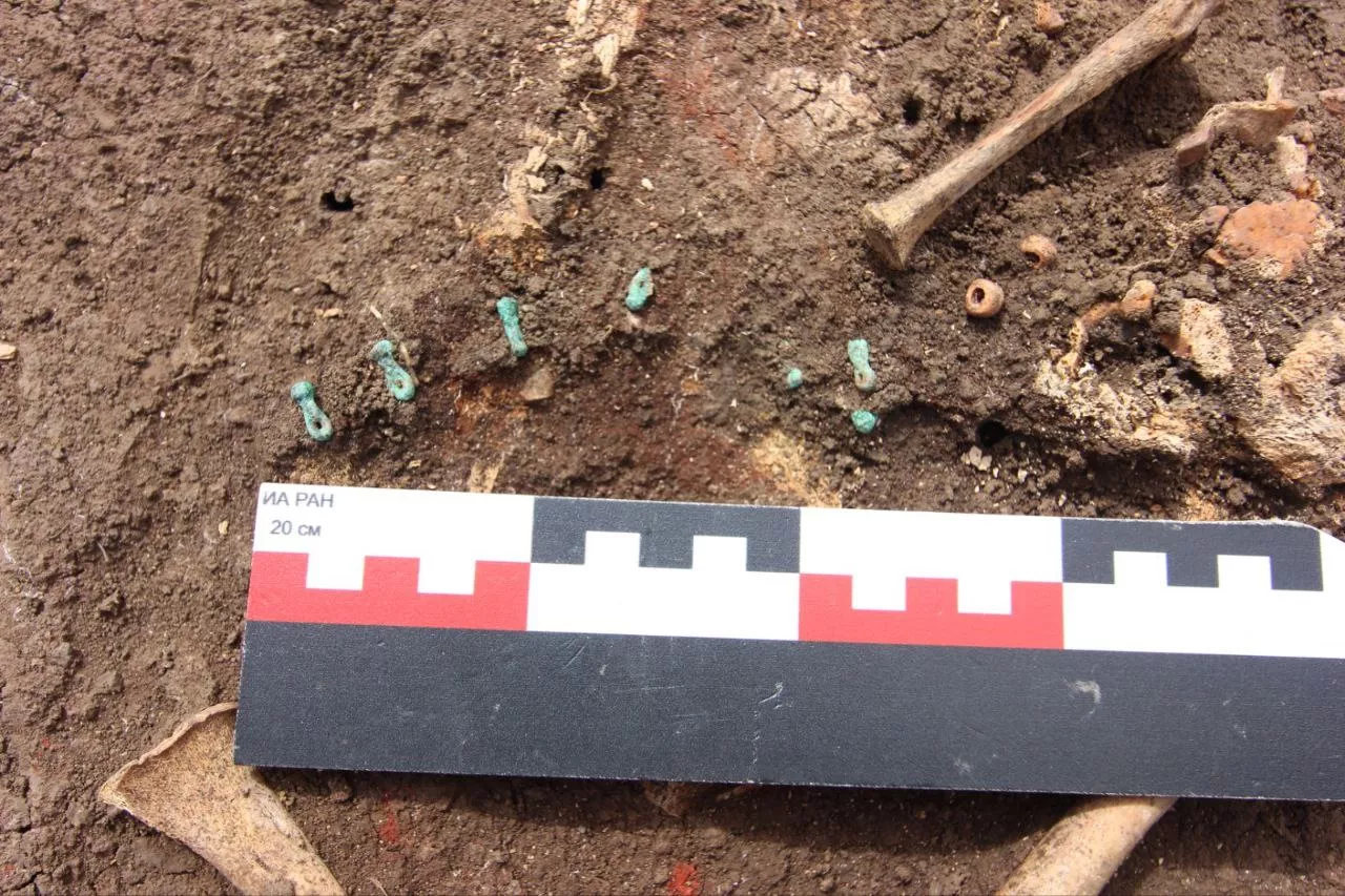 Также в этом кургане были найдены бронзовые подвески возрастом около четырех тыс. лет, уникальный поясной набор, детское погребение каплевидной формы, созданное в 19 веке до н.э., костяные бусы и бронзовая серьга.