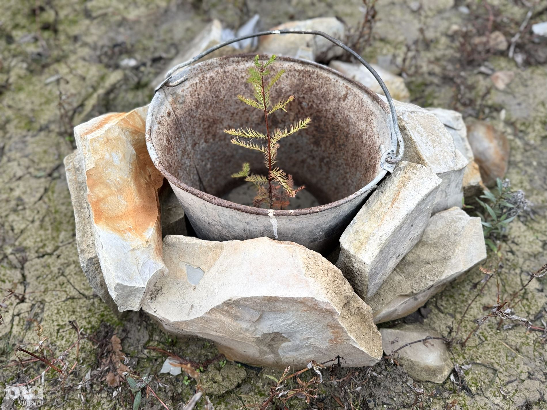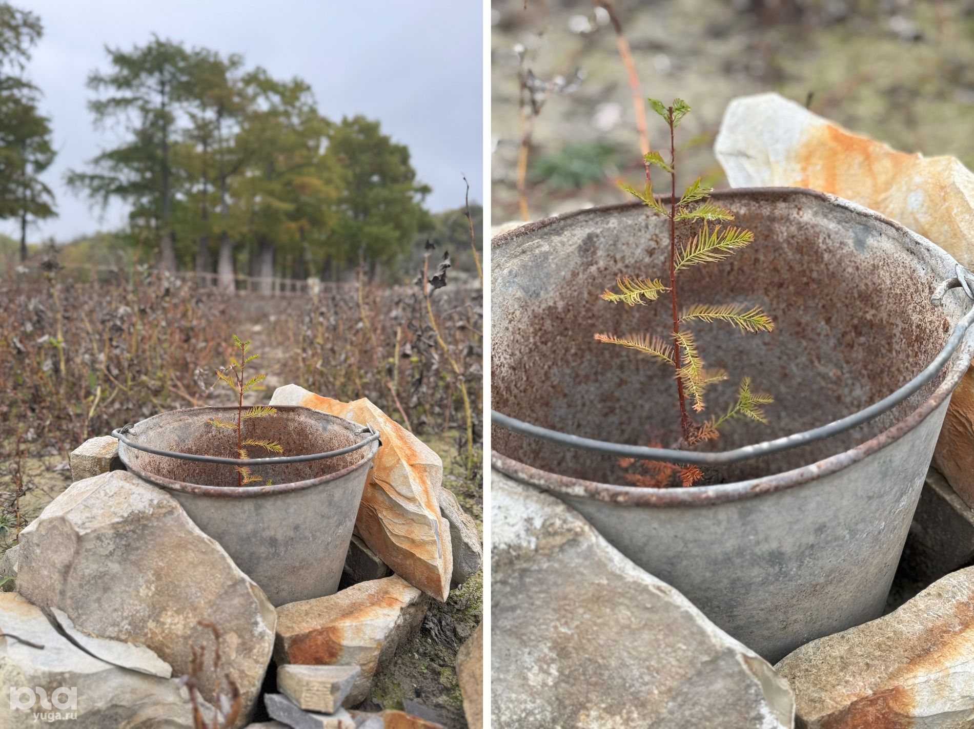 Возле взрослых деревьев взошли молодые кипарисы. Вокруг кустиков уложили камни и организовали полив. Предположительно, это те самые саженцы, которые взошли еще в 2020 году после обмеления озера — некоторые семена деревьев тогда попали в почву. Растения дорастили в теплицах и уже окрепшие кустики вернули к «родителям».
