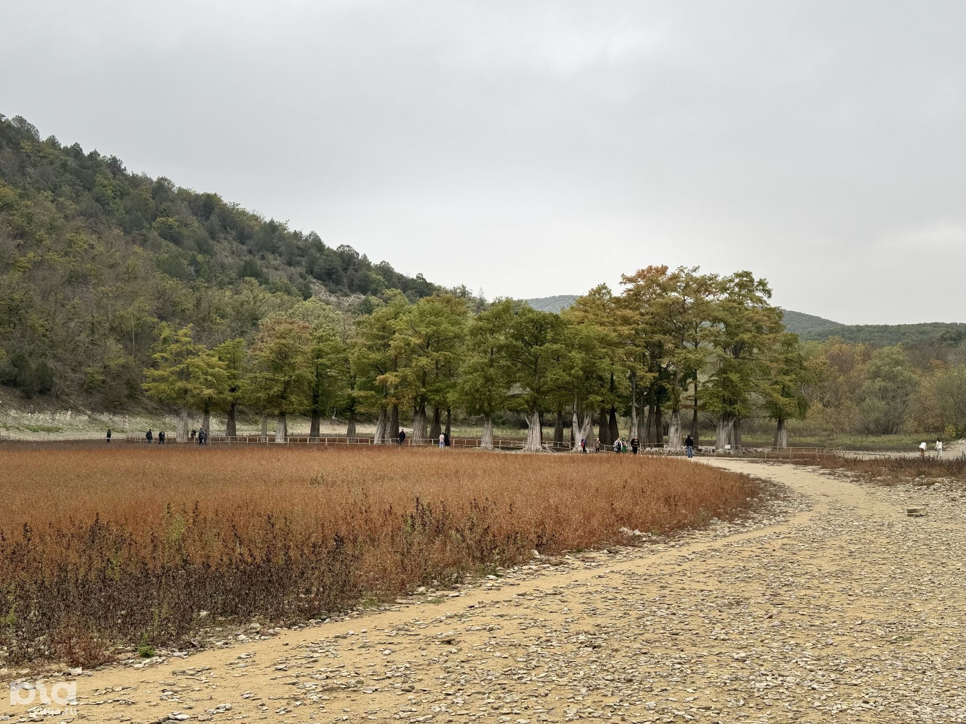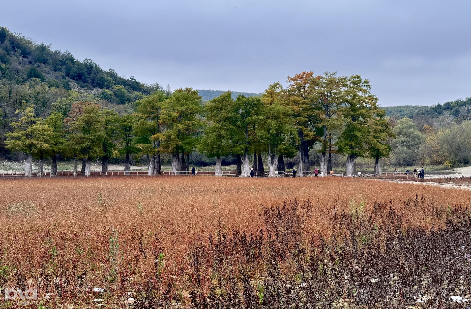 В конце октября — начале ноября листья кипарисов начинают краснеть. Это привлекает еще больше туристов, фотографов и блогеров. 19 октября деревья еще были зелеными и лишь местами начали желтеть. При этом обмелевшая часть озера заросла багровыми кустарниками.