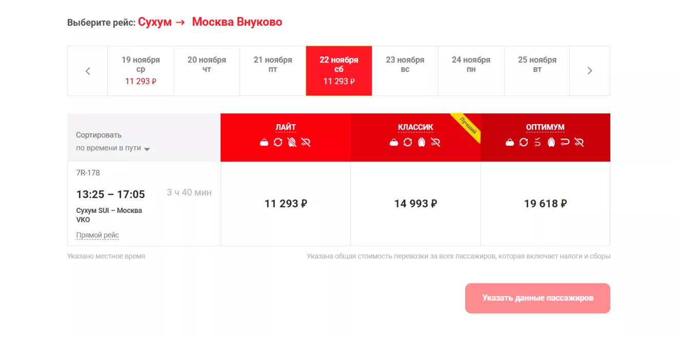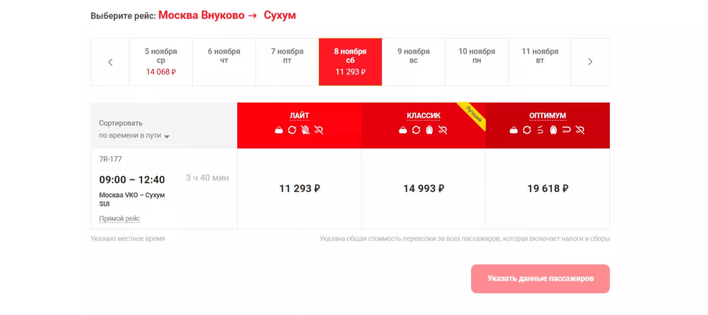 Из Сухума по средам самолет будет отправляться в 16:10, прибытие — в 19:50. По субботам — в 13:25 и 17:05 соответственно. Стоимость билета эконом-класса в ноябре — также от 11 293 рублей.