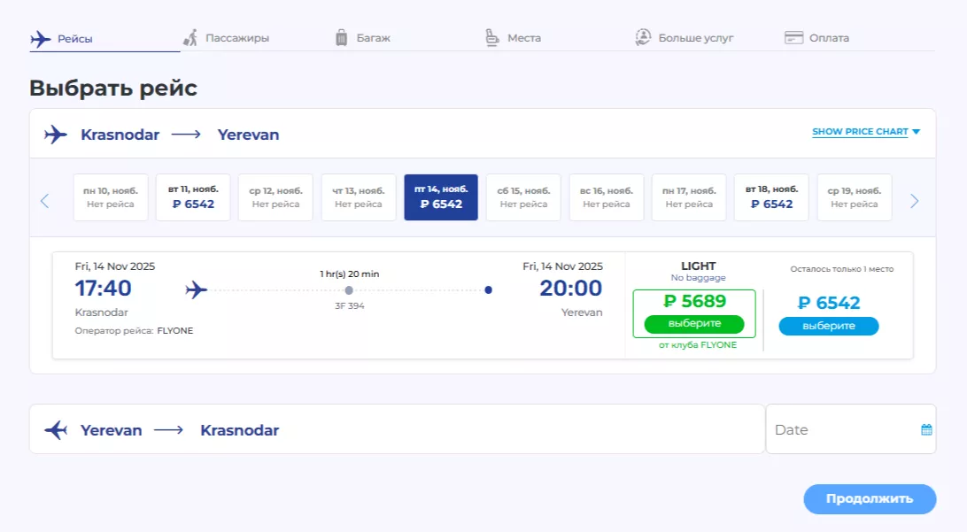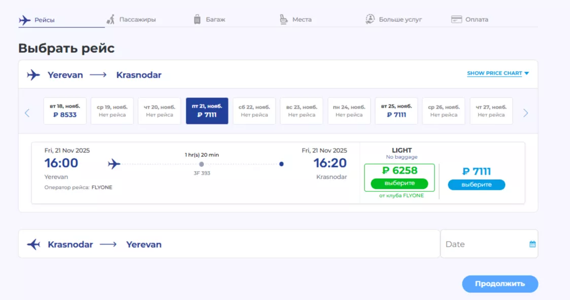 Из Еревана в Краснодар полеты также будут проходить по вторникам и пятницам. Вылет — в 16:00 (по армянскому времени), прилет — в 16:20 (по московскому времени). Стоимость билета эконом-класса — от 6258 рублей.