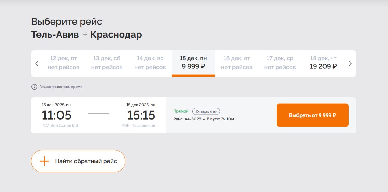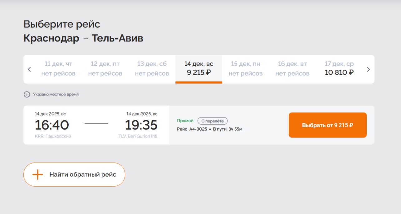 Рейсы из Тель-Авива в Краснодар будут также дважды в неделю, но по понедельникам (вылет в 11:05 по израильскому времени) и четвергам (вылет в 10:10 по израильскому времени). Стоимость билета эконом-класса в декабре — от 9999 рублей.