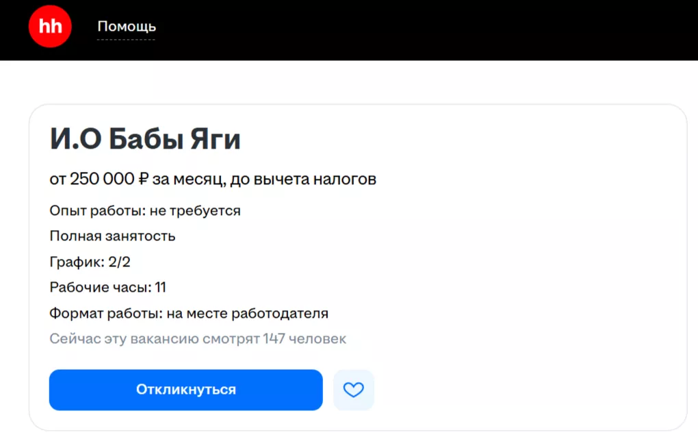 13 ноября на сайте сервиса по поиску работы HH.ru появилась вакансия исполняющей обязанности Бабы Яги в «Сочи Парке». Работодатель предлагает официальное трудоустройство, сменный график 2/2 и конкурентную зарплату — 250 тыс. рублей.