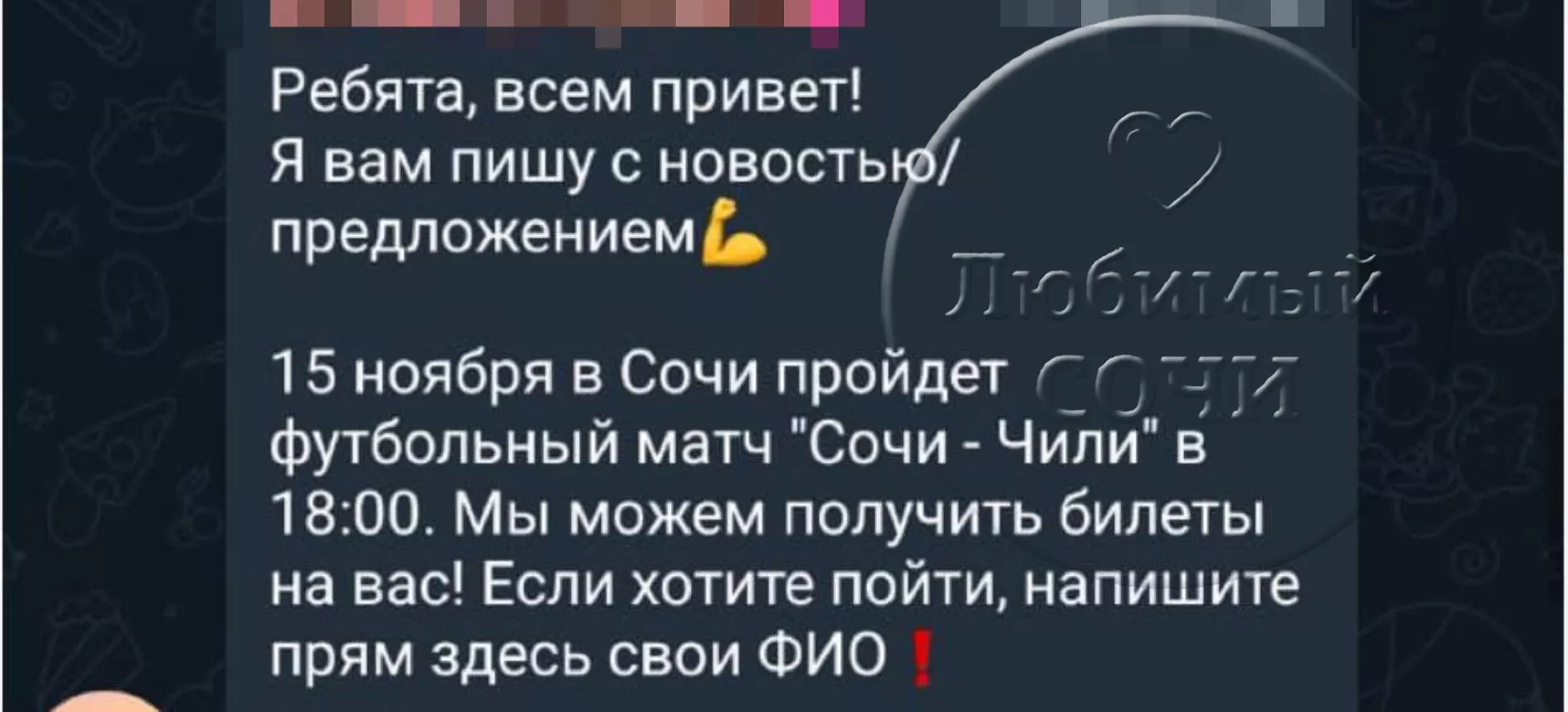 15 ноября телеграм-канал «Любимый Сочи» сообщил, что детям из городского отделения «Движения первых» пообещали билеты на футбольный матч Россия — Чили, прошедший 15 ноября на стадионе «Фишт». Однако за 40 минут до начала игры школьникам отказали.