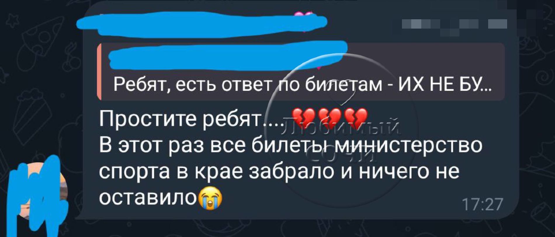 Детям объяснили, что все билеты забрало министерство спорта Краснодарского края. В администрации Сочи ответили, что в октябре к ним поступило предложение выдать бесплатные билеты на матч — «эта задача была выполнена».