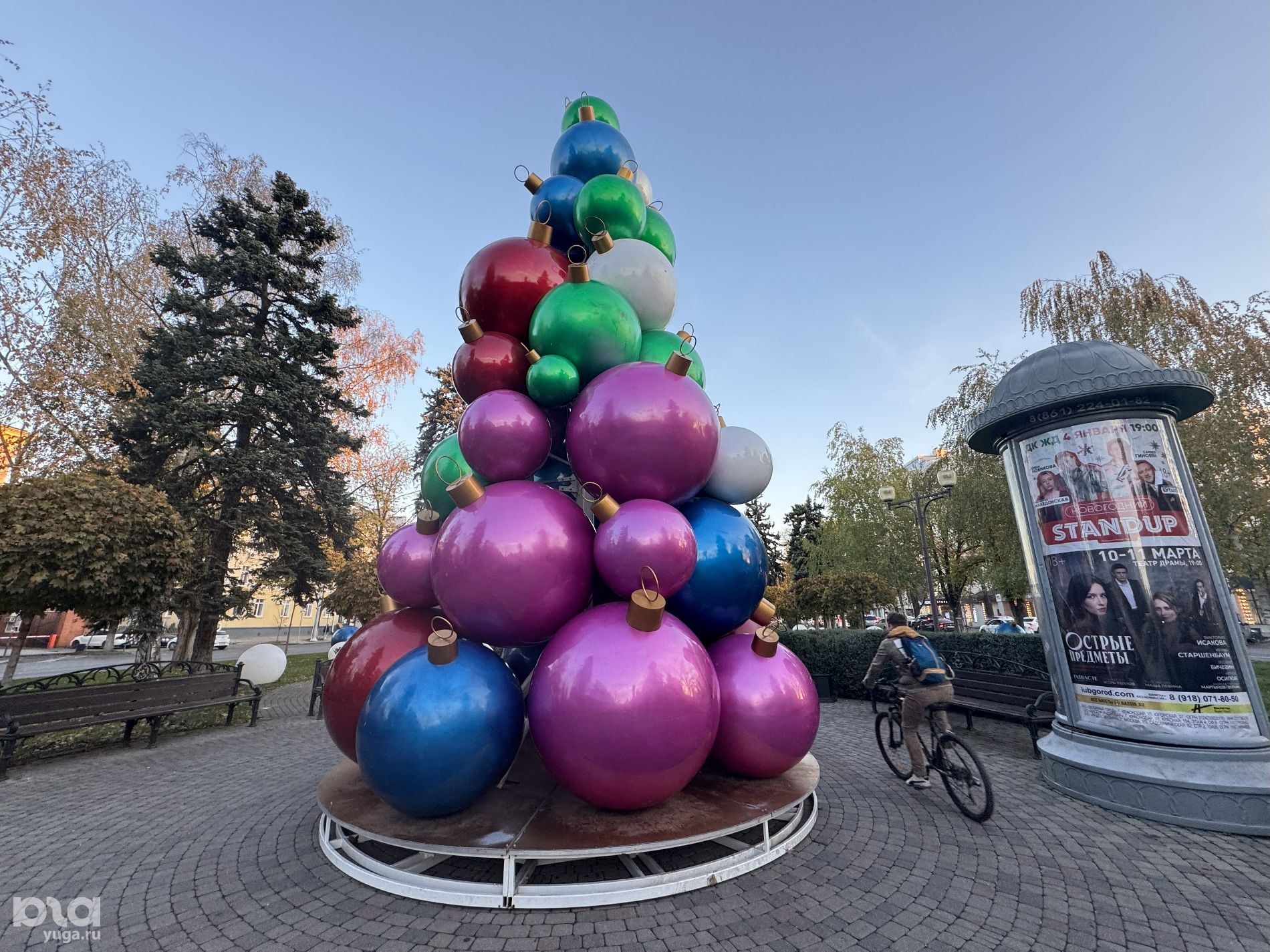 Появилась и первая городская новогодняя елка — ее собрали из огромных разноцветных шаров. Объект находится вблизи Александровской арки, возле гостиницы «Кавказ» и торгового квартала «Центра города». На газонах также разложили огромные новогодние шары.