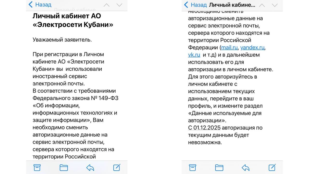 19 ноября житель Краснодара рассказал Юга.ру, что на Gmail ему пришло сообщение от «Электросетей Кубани» с требованием сменить авторизационные данные на электронную почту, сервер которой находится в России — например, mail.ru, yandex.ru и другие.